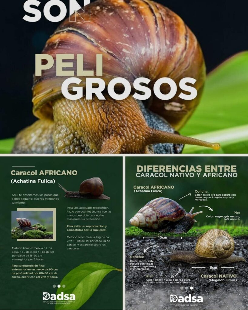 La entidad recalcó que no debe confundirse con el caracol nativo, propio de los ecosistemas locales, el cual no representa peligro y forma parte esencial del equilibrio natural. El africano, en cambio, se alimenta de cultivos, desplaza a especies propias y genera impactos negativos en el ambiente.