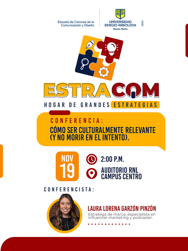 El programa de Comunicación Social y Periodismo de la Universidad Sergio Arboleda Santa Marta, presenta una IX edición de ESTRACOM, certamen académico que promueve la creatividad y el pensamiento estratégico entre sus estudiantes. La actividad se llevará a cabo el próximo 19 de noviembre de 2025, a partir de las 2:00 p.m., en el Auditorio Rodrigo Noguera Laborde de la Institución.