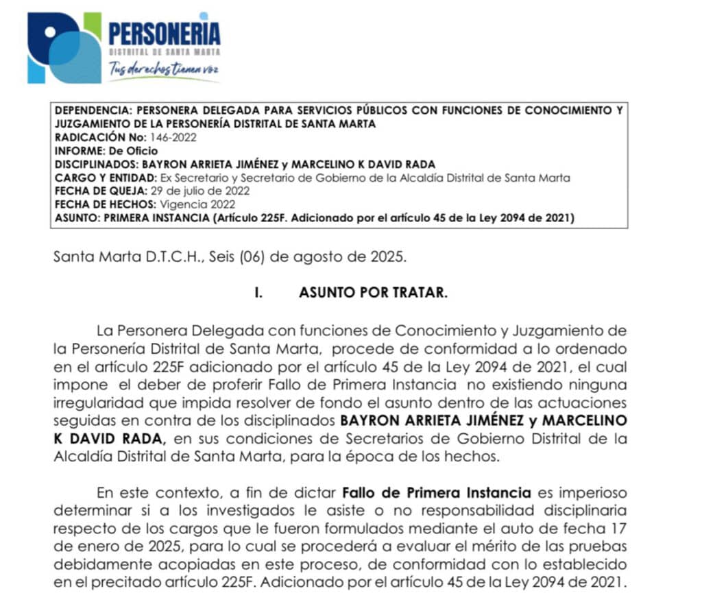 La Personería Distrital de Santa Marta declaró responsables disciplinariamente a Bayron Arrieta Jiménez y a Marcelino José Kdavid Rada, quienes para el año 2022 se desempeñaron como secretarios de Gobierno del Distrito, por extralimitación de funciones al haber suscrito actos administrativos mediante los cuales se declaró la nulidad de elecciones de dignatarios de las Juntas de Acción Comunal de los barrios Villa Chimila II y Bellavista.